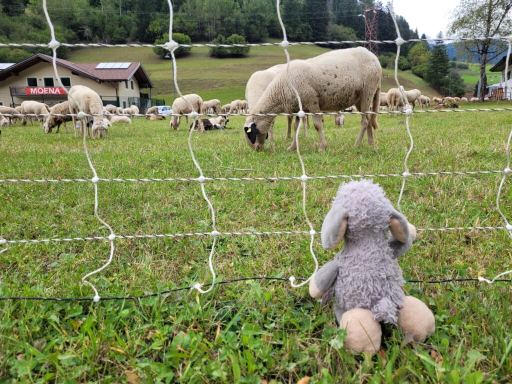 In Moena wird unser Grauschaf im Rucksack unruhig. Sie will kurz ihre italienischen Freunde besuchen