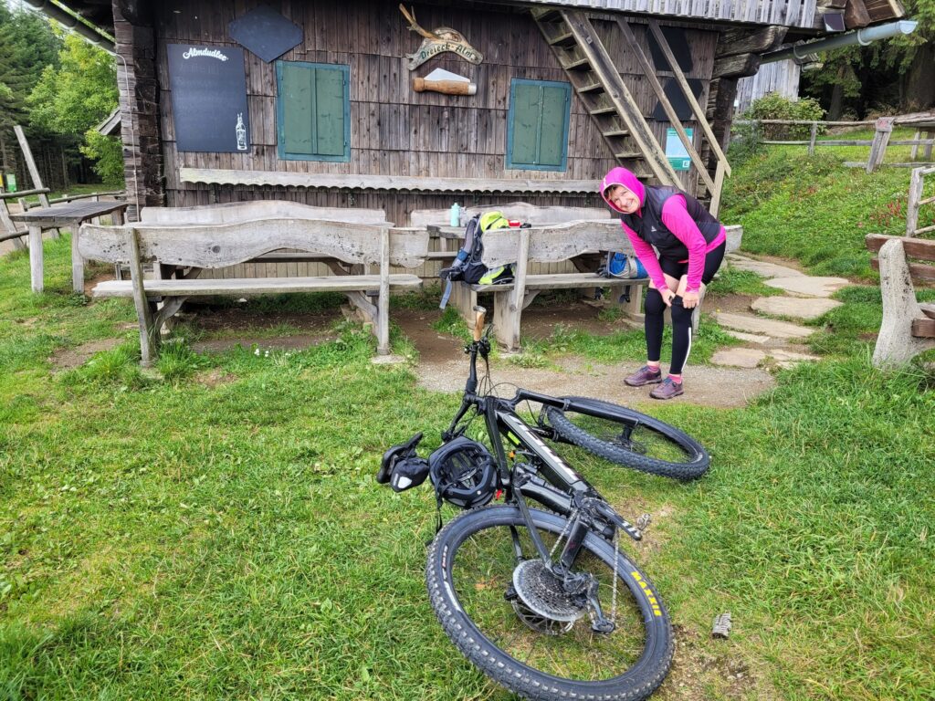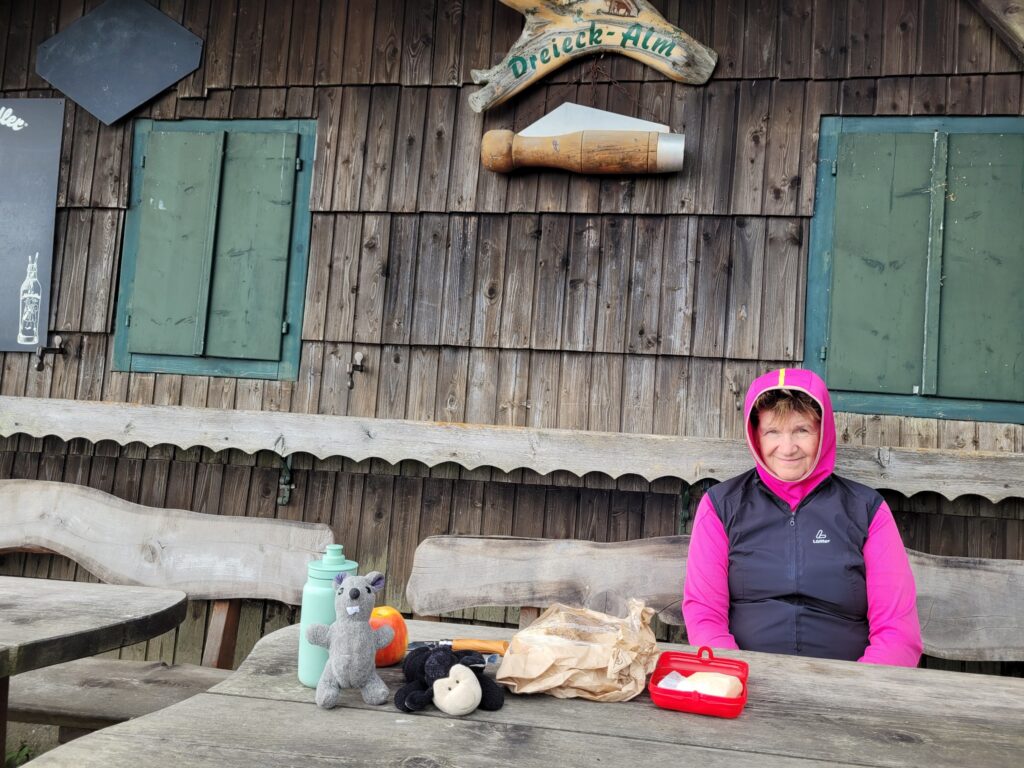 Die Alm hat geschlossen und wir genießen (?) unsere Brotzeit im Windschatten der Hütte.